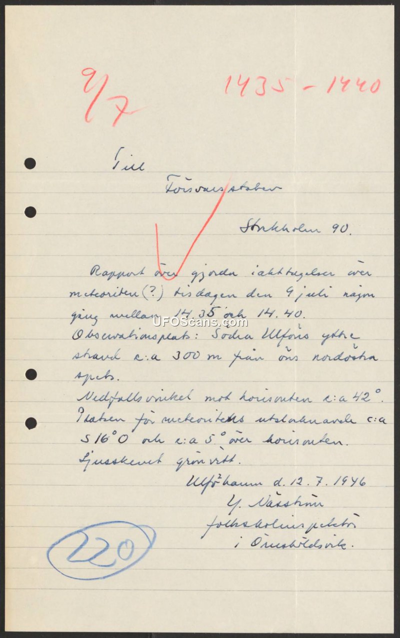 Report on sighting of a meteorite(?) — Södra Ulfön, July 9, 1946