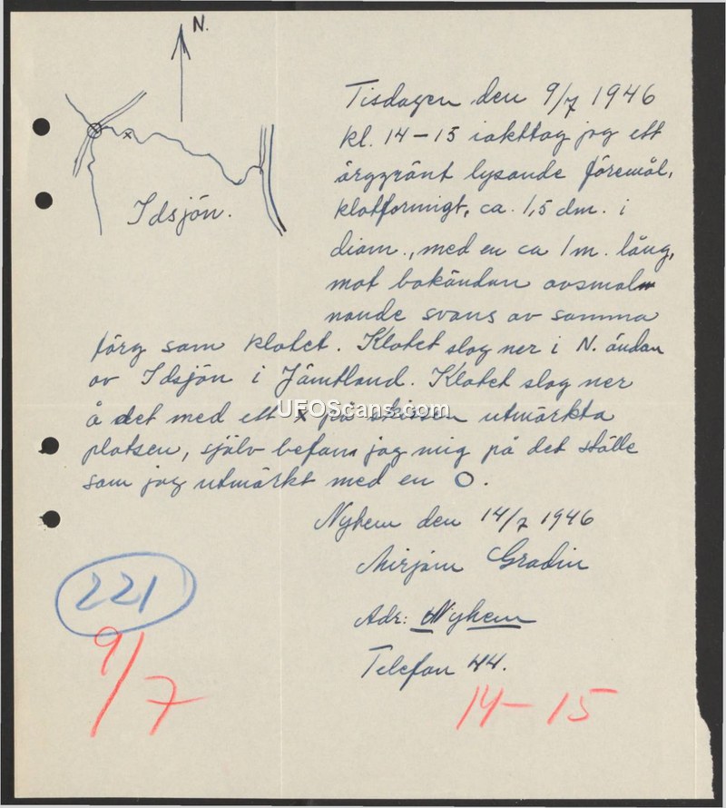 Tisdagen den 9/7 1946 kl. 14-15 iakttog jag ett ärggrönt lysande föremål, klotformigt, ca. 1,5 dm. i diam., med en ca 1m. lång, mot bakändan avsmalnande svans av samma färg som klotet.