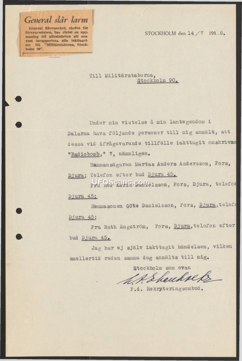 A 1946 report to the Swedish Military Staff documenting four witness accounts of a 'Radio bomb' sighting in Dalarna. The document follows a public appeal by the Chief of the Defense Staff for citizens to report such observations.