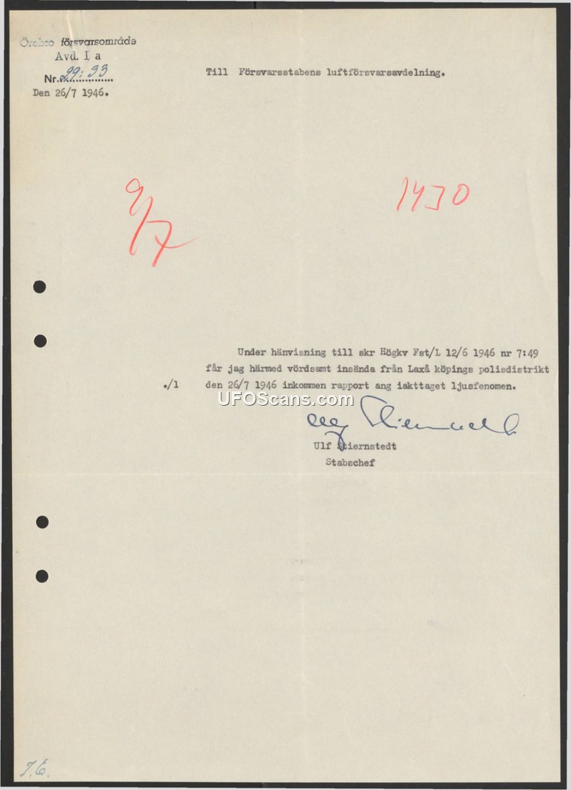 får jag härmed vördsamt insända från Laxå köpings polisdistrikt den 26/7 1946 inkommen rapport ang iakttaget ljusfenomen.