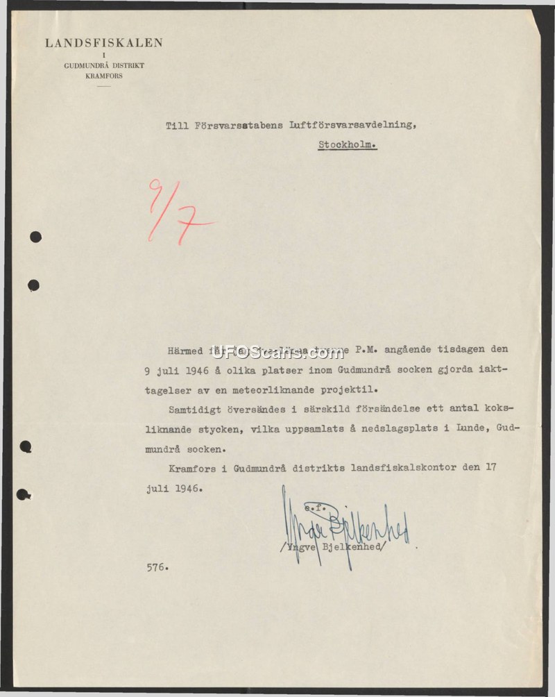 Report on Meteor-like Projectile Sighting — Gudmundrå, Sweden, July 1946