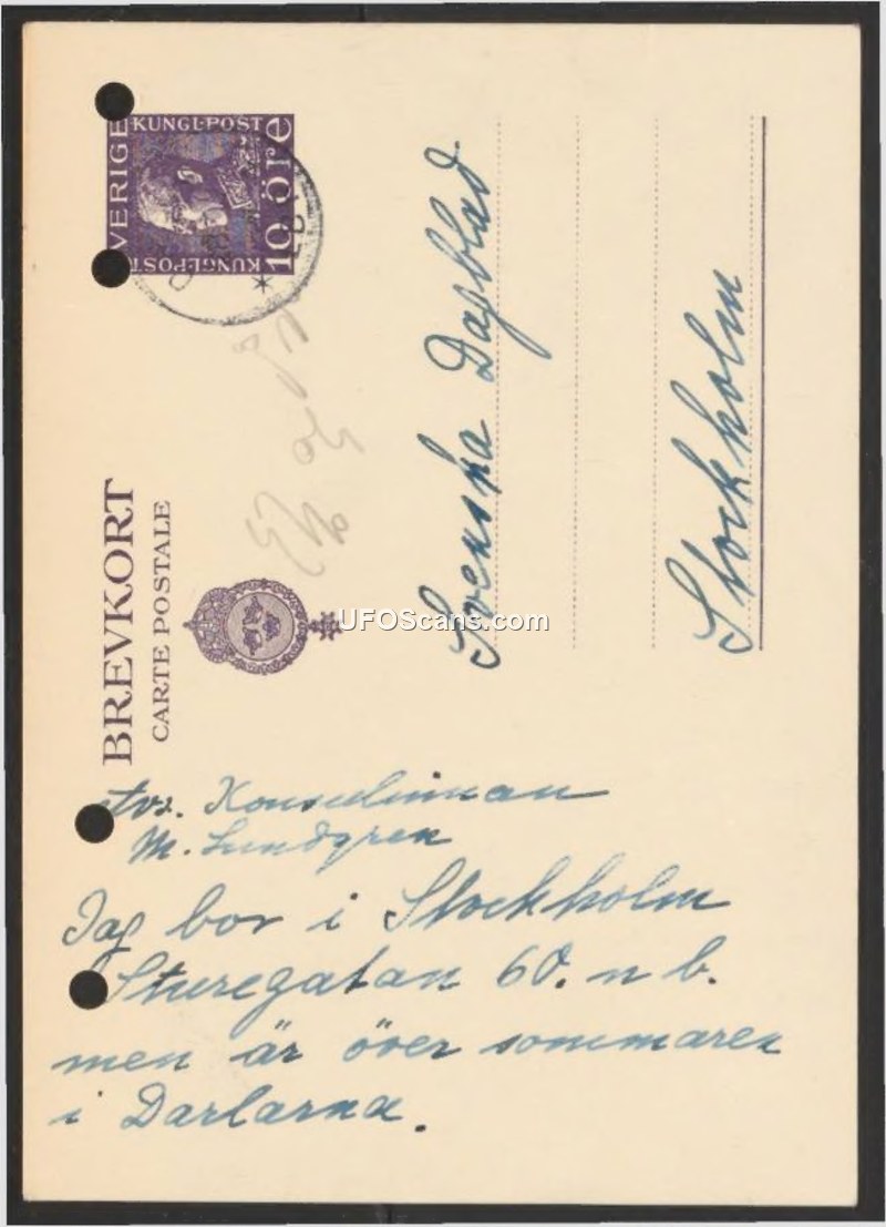 A personal postcard sent to the newspaper Svenska Dagbladet by M. Lundgren to provide her residential address in Stockholm and her summer location in Dalarna.