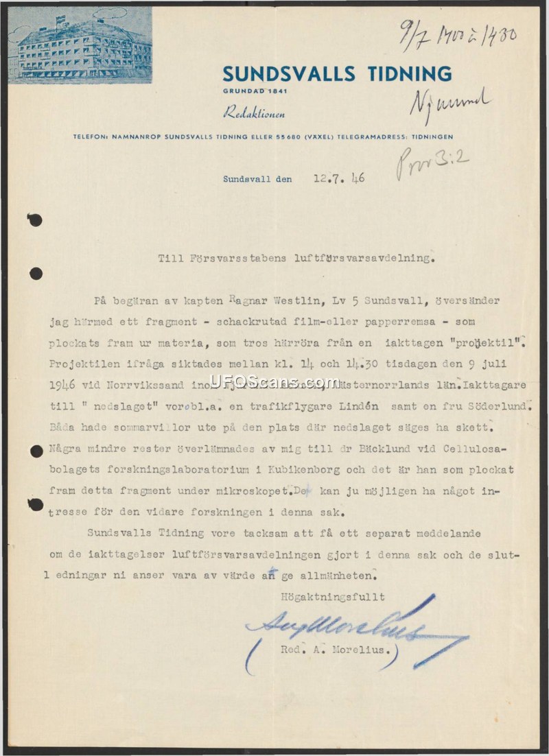 On July 12, 1946, the editor of the newspaper Sundsvalls Tidning, A. Morelius, wrote to the Air Defense Department of the Swedish Defense Staff. The letter concerns an incident that occurred on July 9, 1946, between 14:00 and 14:30 at Norrvikssand in Njurunda parish, Västernorrland County. Witnesses, including a traffic pilot named Lindén and a Mrs. Söderlund, observed a 'projectile' that reportedly impacted the area where they owned summer villas. At the request of Captain Ragnar Westlin of the Lv 5 unit in Sundsvall, the editor submitted a physical fragment—described as a checkered film or paper strip—that had been recovered from the site. This fragment had been examined under a microscope by a Dr. Bäcklund at the Cellulose Company's research laboratory in Kubikenborg. The editor expressed hope that the fragment might be of interest for further research and requested that the Air Defense Department share any observations or conclusions they reached regarding the incident, particularly those deemed valuable for the public to know.