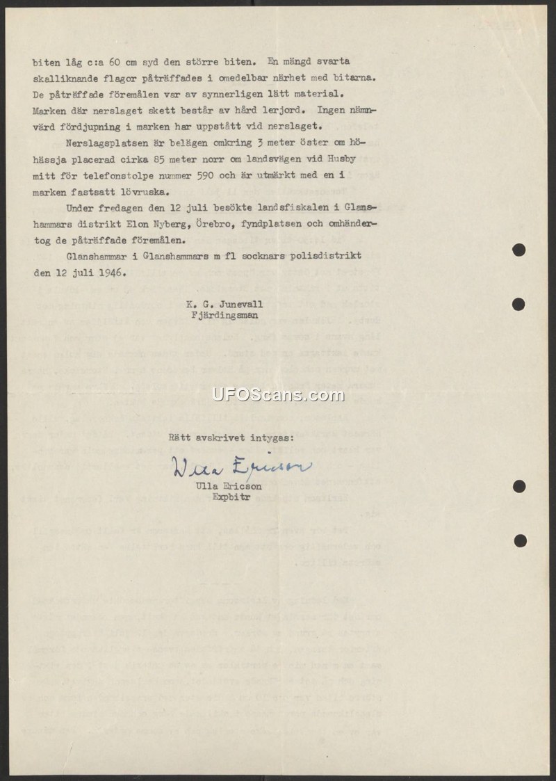 A 1946 Swedish police report detailing the recovery of lightweight, black, shell-like material from an impact site in Glanshammar. The items were collected by the district prosecutor for further investigation.