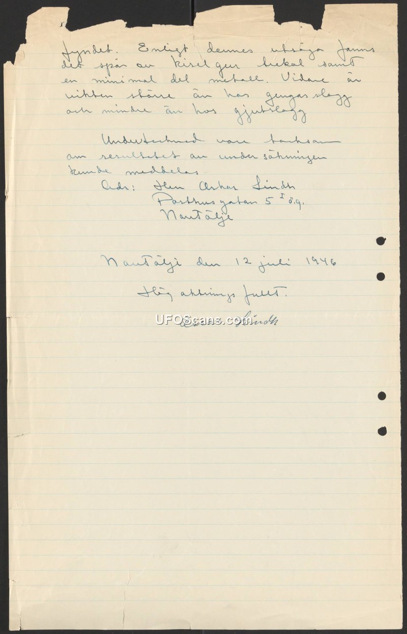 This document is a letter dated July 12, 1946, written by Oscar Lindh from Nautälje, Sweden. The author discusses the results of an investigation into a specific 'find'. According to the letter, the analysis of this find revealed traces of silica, nickel, and a minimal amount of metal. The author further characterizes the material by comparing its size to industrial byproducts, noting that it is larger than producer gas slag but smaller than foundry slag. The letter concludes with a request for the results of the investigation to be communicated to Mr. Arhar Lindh, residing at Parthusgatan 5, Nautälje.