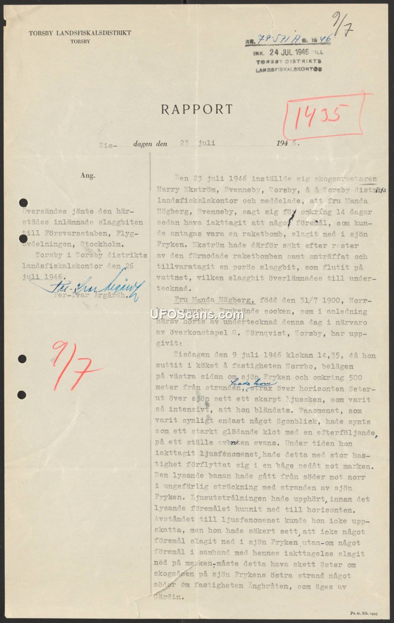 This report, dated July 26, 1946, from the Torsby Landsfiskalsdistrikt, documents a sighting reported by Manda Högberg of Norrbo, Sweden. On July 9, 1946, at 14:35, while in her kitchen, Högberg observed a bright, intense light that blinded her. She described the phenomenon as a glowing sphere with a tail that moved at high speed in a downward arc from south to north, roughly parallel to the shore of Lake Fryken. The light disappeared before reaching the horizon. Högberg stated she did not see any object hit the lake, but speculated that if something had hit the ground, it would have been east of the forest ridge on the eastern shore of the lake, near the property Ångbråten. Following this report, a forest worker named Harry Ekström searched the area and recovered a porous piece of slag that had been floating on the water. This slag was submitted to the Swedish Defense Staff (Försvarsstaben) in Stockholm for further investigation.
