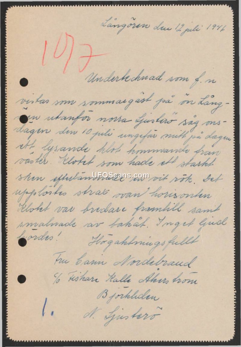 Sighting Report - Långören, Sweden, July 10, 1946