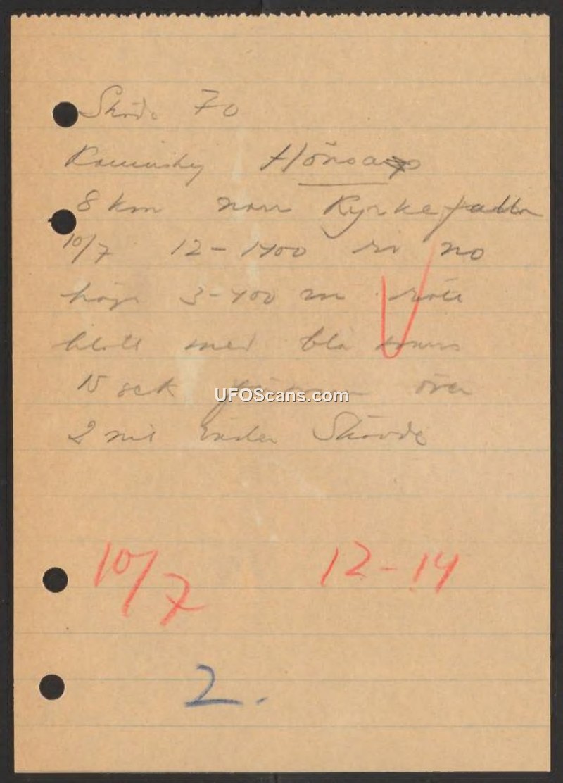A handwritten report of an unidentified aerial object observed near Skövde, Sweden, on July 10, 1970. The object was described as blue and sighted at an altitude of 300-400 meters.