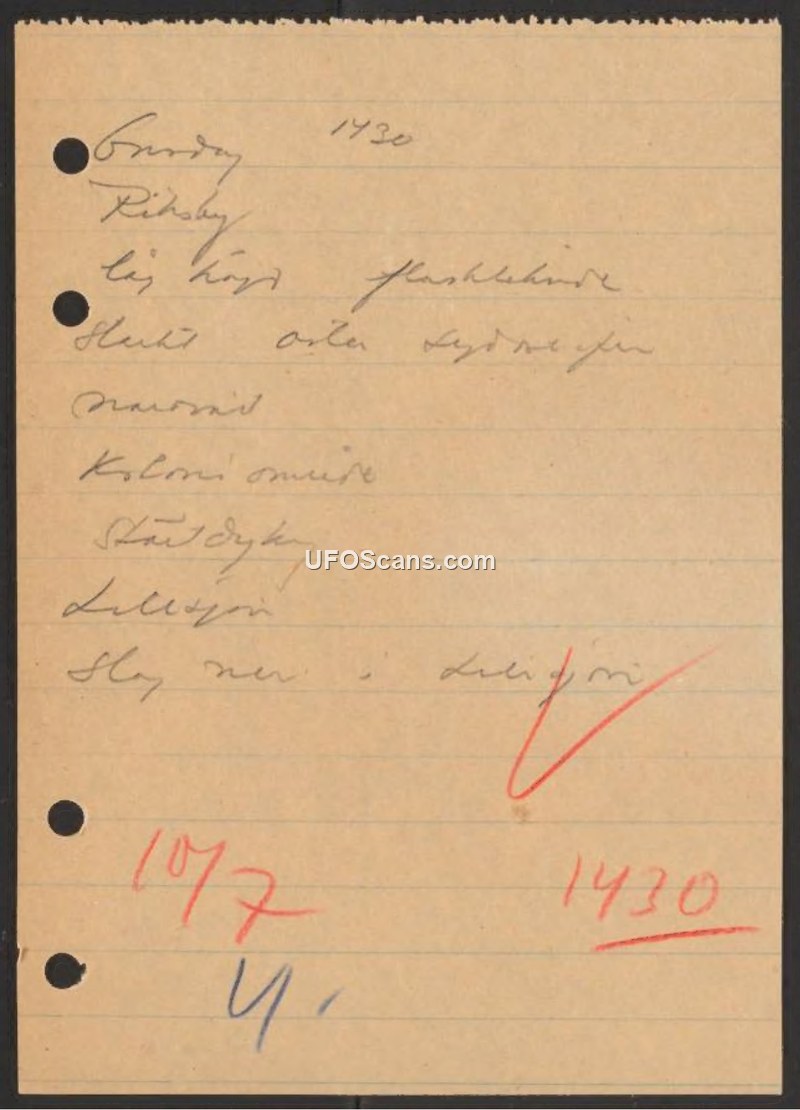 This document consists of a brief, handwritten set of notes in Swedish, dated to a Sunday at 1430 hours. The text appears to be a log or record of an event. It mentions 'Riksby', 'Lillsjön', and 'Koloniområde' (colony area). The final line reads 'Sly ner i Lillsjön', which translates to 'Sly down into Lillsjön' or 'Sly down in Lillsjön'. Due to the brevity and the nature of the handwriting, the context of the event remains unclear. The document also contains the number '107' and the time '1430' written in red ink.