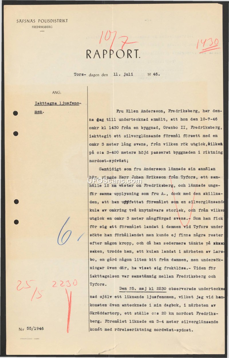 A Swedish police report from 1946 details two sightings of silver, tail-bearing aerial objects. Investigations into a suspected landing site in Tyfors yielded no physical evidence.