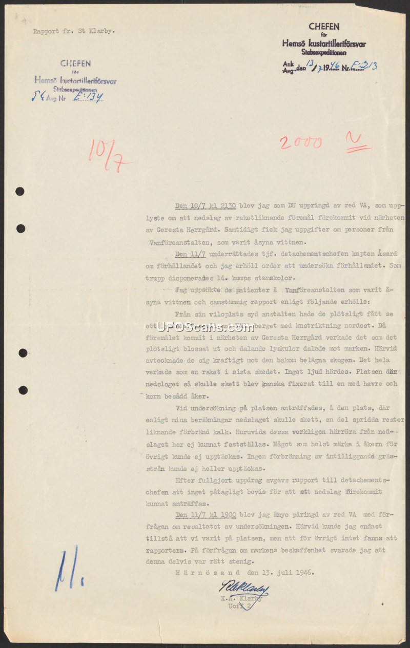 This report, dated July 13, 1946, details an investigation conducted by K.A. Klarby of the Hemsö Coastal Artillery Defense into a reported sighting of a rocket-like object. On the evening of July 10, 1946, at 21:30, the author was notified by 'red VA' regarding a potential crash near Geresta Herrgård. The report was based on eyewitness accounts from patients at the Vanföreanstalten facility. According to the witnesses, they observed a luminous object moving toward Fälleberget in a northeasterly direction. They described the object as suddenly flaring up, with descending lights falling toward the ground, resembling a rocket in its final stage. No sound was reported. Following orders from Captain Åsard, the author investigated the site where the object was calculated to have landed, which was identified as a field sown with oats and barley. The investigation uncovered only scattered remains resembling burnt lime. The author could not determine if these remains were related to the reported event, and no other marks or signs of burning on the surrounding grass were found. Consequently, the author reported to the detachment commander that no tangible evidence of a crash could be found. On July 11, the author was contacted again by 'red VA' for the results, and he confirmed that while he had visited the site, there was nothing further to report, noting only that the ground was partially quite stony.