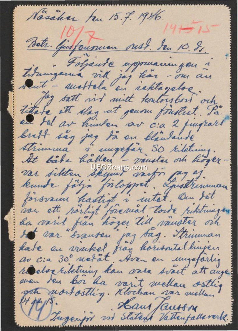 Sighting Report by Hans Jansson, Näsäker, 15 July 1946