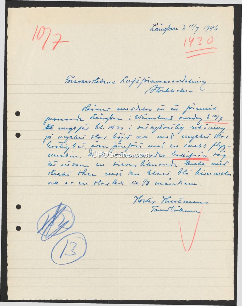 A report from the Swedish Defence Staff detailing a sighting of a high-speed, silver, spherical object over Långban, Sweden, on July 10, 1946.