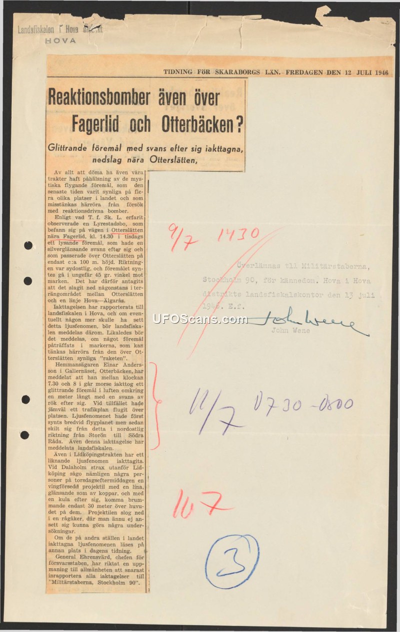 This document, dated July 12, 1946, is a newspaper report from the Skaraborg region of Sweden detailing several sightings of mysterious flying objects. The article notes that these sightings are part of a broader national trend and are suspected to be related to experiments with reaction-driven bombs. Specific incidents include a sighting near Fagerlid on Tuesday, July 9, where a shining object with a silver tail passed at an altitude of approximately 100 meters. Another witness, Einar Andersson, reported seeing a one-meter-long object with a smoke tail near Otterbäcken on the morning of July 10, which appeared to separate from a passing aircraft. A third report from the Lidköping area describes a copper-colored, winged projectile with a tail that flew at a low altitude of 30 meters before crashing into a rye field. The document includes a handwritten administrative note addressed to the military headquarters in Stockholm, dated July 13, 1946, and signed by John Wene, acknowledging the reports. The article concludes by relaying an official request from General Ehrensvärd, Chief of the Defense Staff, urging the public to report all such sightings to the military authorities.