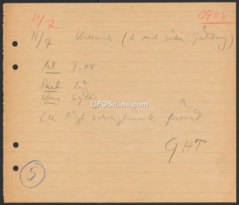 This document is a brief, handwritten record of a sighting that occurred on November 7 at 9:08. The location of the event is identified as Kullavik, situated approximately two Swedish miles south of Gothenburg. The observer reported seeing a long, cigar-shaped object. The note includes the reference number 0908 and the number 5, likely indicating a file or sequence number. The text is written in Swedish and provides minimal descriptive detail regarding the object's behavior or characteristics beyond its shape.