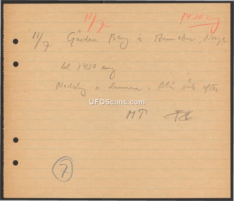 A brief handwritten report of an aerial sighting in Drøbak, Norway, on July 1st at 14:30.
