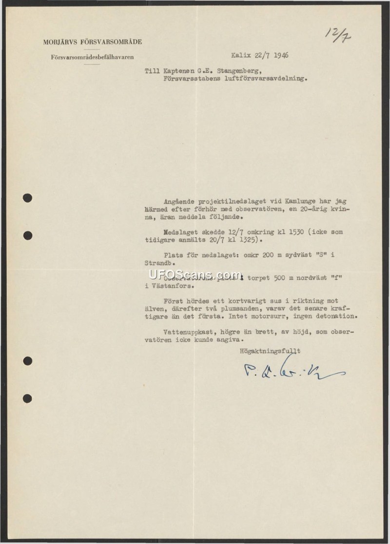 This document is a formal report issued on July 22, 1946, by the Morjärv Defense District to Captain G.E. Stangenberg of the Defense Staff's Air Defense Department. The report concerns a projectile impact incident that occurred near Kamlunge on July 12, 1946, at approximately 15:30 hours. The author notes that this date corrects a previous report that had incorrectly cited July 20 at 13:25. The information was gathered through an interrogation of a 20-year-old female witness. The witness, located at a croft 500 meters northwest of 'f' in Västanfors, reported hearing a short rushing sound directed toward the river. This was followed by two distinct splashes, with the second splash described as more powerful than the first. The witness observed a water spray that was higher than it was wide, though she could not estimate the specific height. The report explicitly states that there was no motor hum and no detonation associated with the event. The impact site was identified as being approximately 200 meters southwest of 'S' in Strandb.