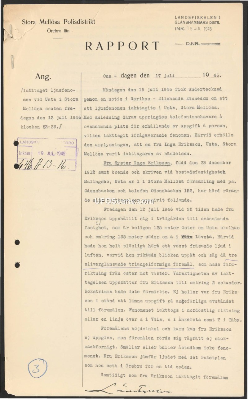 This police report from the Stora Mellösa Police District, dated July 17, 1946, documents a sighting of an aerial phenomenon reported by Inga Eriksson. On July 15, 1946, the police were alerted to the sighting via a notice in the newspaper Nerikes-Allehanda. Upon investigation, it was determined that on the evening of July 12, 1946, at approximately 22:00, Mrs. Eriksson was in the garden of her residence at Malingsbo, Usta nr 1. She reported hearing a sharp hissing sound in the air, which prompted her to look upward. She observed three silver-shining, triangular objects moving horizontally from east to west. The observation lasted approximately two seconds. Mrs. Eriksson noted that the objects did not move in a zigzag pattern and did not produce any explosions or other noises, though she compared the sound to that of a jet plane she had previously observed in Örebro. No smoke trails were observed, and she could not estimate the distance to the objects. The phenomenon was observed in a northeasterly direction, along a line over Väla, Ånkersta, and Täby.