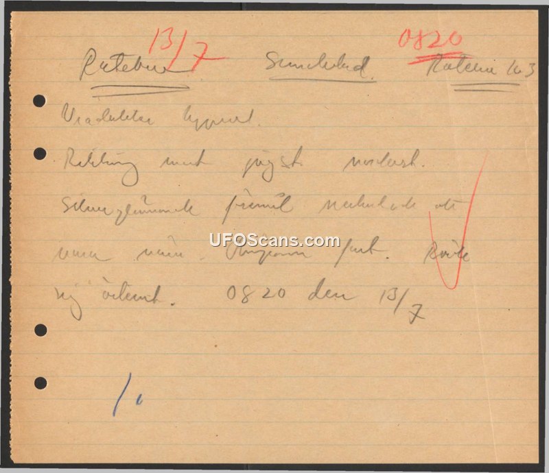 This handwritten document appears to be a brief field report or log entry dated July 13th. The text, written in Danish, notes a time of 08:20. The content is sparse and difficult to fully decipher due to handwriting, but it references an observation or incident occurring at the noted time on the 13th of July.
