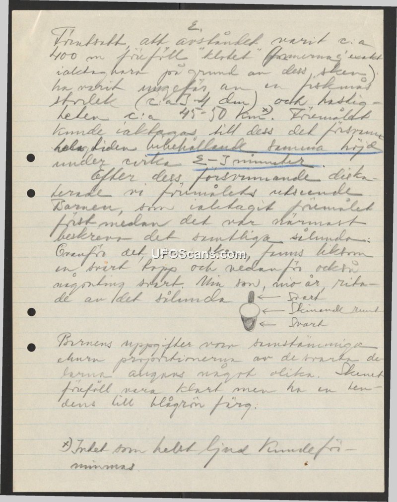 This handwritten document provides an account of an unidentified aerial object sighting. The report notes that the object was observed at an altitude of approximately 400 meters. The witnesses, identified as children, described the object as being roughly the size of a fishing boat (approximately 4-5 decimeters). The object was described as having a light green color with a shiny, round appearance. It featured a black body on the top and something black underneath. The object remained at a constant altitude for a duration of 2 to 3 minutes before disappearing. The report explicitly states that the witnesses heard absolutely no sound during the event. The children's accounts were described as consistent, despite minor variations in their descriptions of the object's proportions.