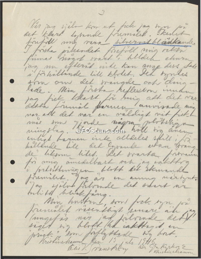 A handwritten account from July 15, 1946, in Kristinehamn, Sweden, detailing the observation of a shiny, silver object and a secondary black object. The witness describes the objects as having erratic movement.