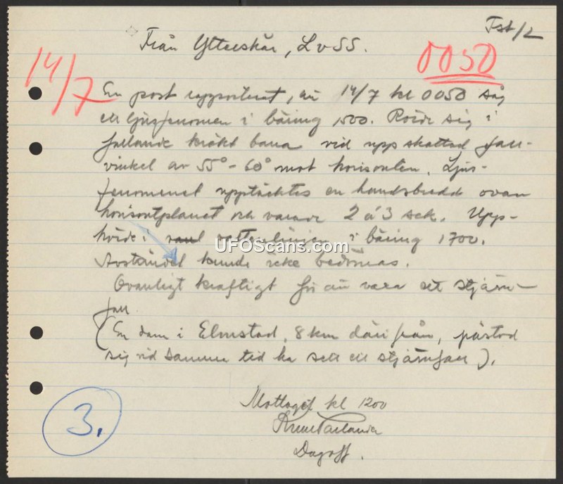 A report of a bright, unidentified light phenomenon observed in Sweden on July 14, 1950. The object was noted for its unusual brightness compared to a typical shooting star.