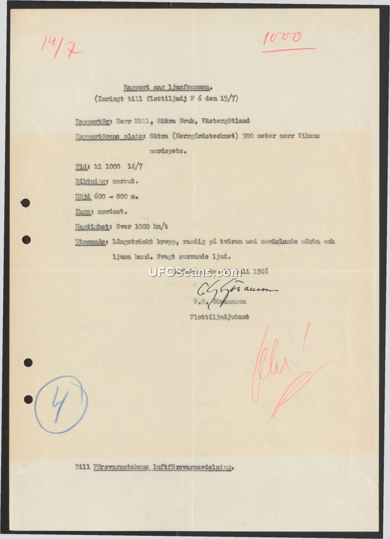 A report from July 1946 detailing a sighting of an elongated, striped aerial object traveling at high speed over Sätra, Sweden. The document was filed by military personnel at Flottilj F 6 to the Defense Staff.