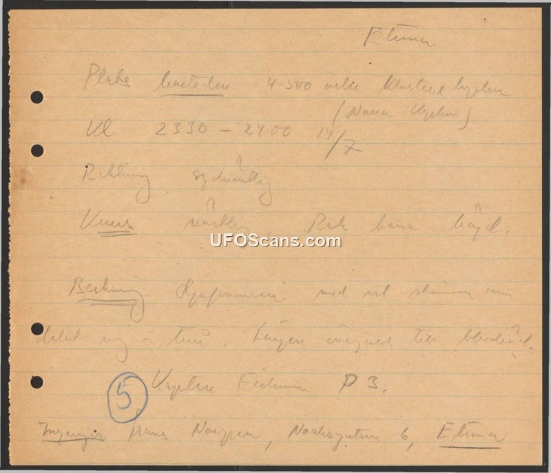 This handwritten document is a brief sighting report from Norway, dated July 14th. It records an observation of 400 to 500 objects occurring between 23:30 and 24:00. The report notes the direction as southerly and describes the flight path as a straight line that then curved. The objects were observed to split in two. The document mentions a Captain [illegible] and an Engineer [illegible] associated with an address at [illegible] 6, Elima.