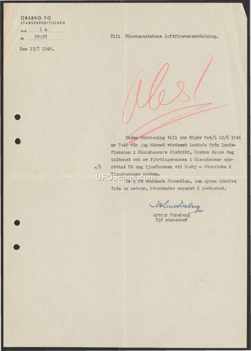 This document is a formal letter dated July 13, 1946, issued by the Örebro FO Staff Expedition (Örebro FO Stabsexpeditionen) and addressed to the Air Defense Department of the Defense Staff (Försvarsstabens luftförsvarsavdelning). The letter references a previous communication from the Defense Staff dated June 12, 1946 (reference number 7:49). The purpose of the letter is to forward a memorandum (PM) regarding a light phenomenon observed at Husby-Storsicke in Glanshammar parish. This memorandum was prepared by the local constable (fjärdingsmannen) in Glanshammar and submitted by the district prosecutor (landsfiskalen) in Örebro. Furthermore, the letter notes that physical objects mentioned in the memorandum, which are suspected to be remnants of a meteor, have been sent separately in a postal package. The letter is signed by Arthur Forsberg, acting Chief of Staff.