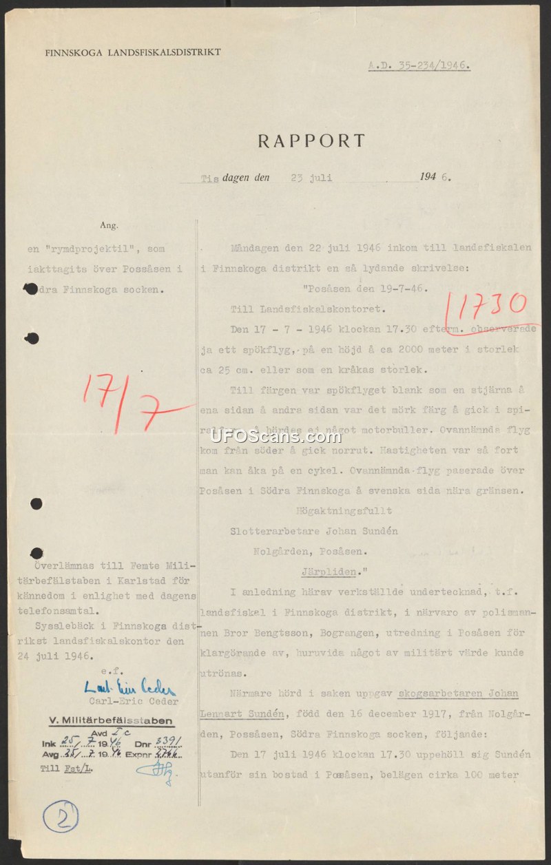A 1946 Swedish police report documents a sighting of a silent, spiral-moving aerial object over Possåsen. The report was forwarded to the Fifth Military Command for further assessment.