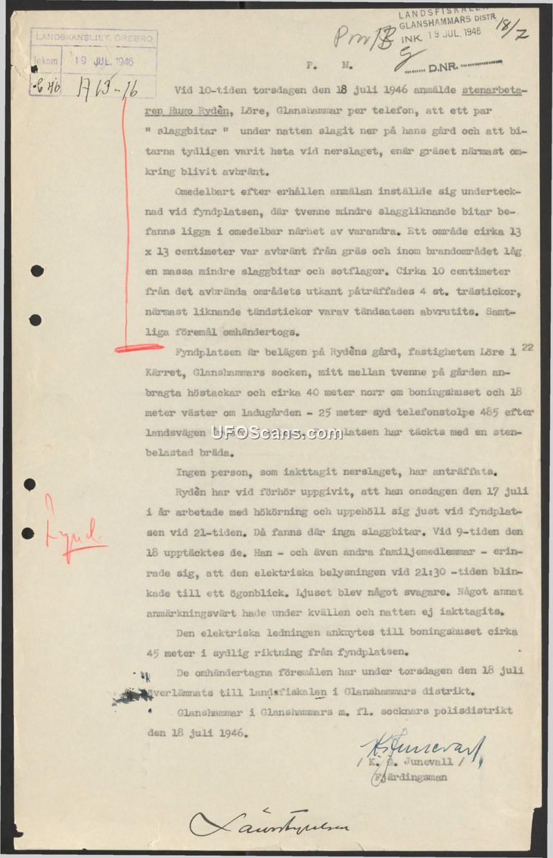On July 18, 1946, a stone worker named Hugo Rydén reported to the Glanshammar district authorities that 'slag-like' objects had struck his farm during the night. He claimed the objects were hot upon impact, as the surrounding grass was scorched. Upon investigation, the authorities found two small slag-like pieces and a 13x13 centimeter area of scorched grass containing soot flakes. Additionally, four wooden sticks, resembling matches with the ignition heads broken off, were discovered approximately 10 centimeters from the scorched area. The site was located on Rydén's property, Löre 1:22 Kärret, situated between two haystacks, 40 meters north of the residential house, and 25 meters west of the barn. Rydén stated that he had been working in the field at 21:00 on July 17 and observed no such objects at that time; they were discovered the following morning at 09:00. He and his family recalled that the electric lights in the house flickered and dimmed momentarily at 21:30 on the evening of the 17th. No witnesses to the actual impact were identified. The recovered items were handed over to the district authorities on July 18, 1946.