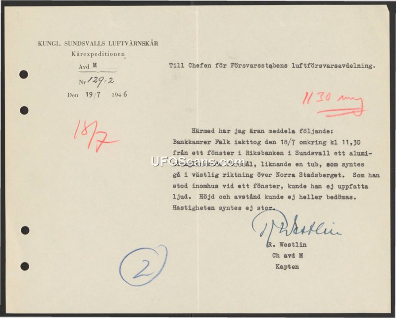 On July 19, 1946, Captain R. Westlin of the Royal Sundsvall Anti-Aircraft Corps (Kungl. Sundsvalls Luftvärnskår) submitted a report to the Chief of the Defense Staff's Air Defense Department regarding an aerial sighting. The report details an observation made on July 18, 1946, at approximately 11:30 AM by a bank clerk named Falk. While at the Riksbank in Sundsvall, Falk observed an aluminum-shining, tube-like object moving in a westerly direction over Norra Stadsberget. Because the witness was inside the building looking through a window, he was unable to hear any sound associated with the object. Furthermore, the report notes that it was impossible to estimate the altitude or distance of the object, and its speed could not be determined.