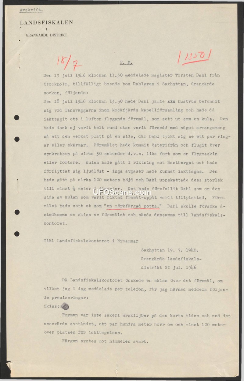 This memorandum, dated July 20, 1946, documents a report received by the Landsfiskal (District Prosecutor) of Grangärde regarding an aerial sighting. On July 19, 1946, Magister Torsten Dahl, a resident of Stockholm currently staying in Saxhyttan, reported that on the previous day, July 18, at 13:50, he and his wife were at Tansväggarna in the Mockfjärd parish. During this time, they observed an object in the sky that appeared spherical but was not perfectly round. Dahl noted that the object appeared flattened on one side, where he believed he saw rings or screens. The object approached from the east and traversed the horizon in approximately 30 seconds, moving at a speed comparable to or faster than an airplane. The object traveled toward Bastberget in complete silence, with no visible exhaust. Dahl estimated the object's altitude at approximately 100 meters and its size at a minimum of 0.5 meters in diameter. He described the object as resembling a 'dark-colored pot.' The document notes that Dahl intended to provide a sketch of the object to the district office. A follow-up note from July 20, 1946, clarifies that the form of the object was difficult to discern due to the short observation time and the distance, which was estimated at a few hundred meters north and at least 100 meters above the observation point. The color of the object was described as black against the sky.
