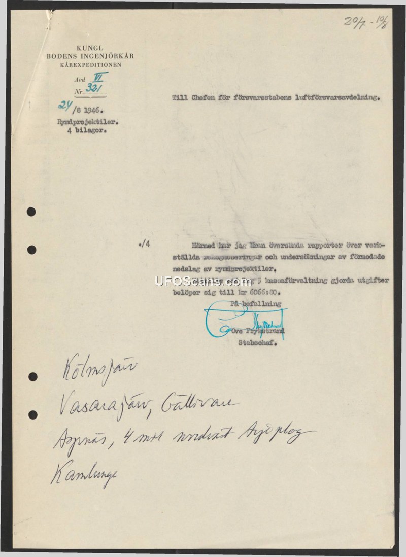 A 1946 Swedish military document transmitting reports on investigations into suspected rocket impacts. It notes specific financial expenditures and lists several geographic locations.