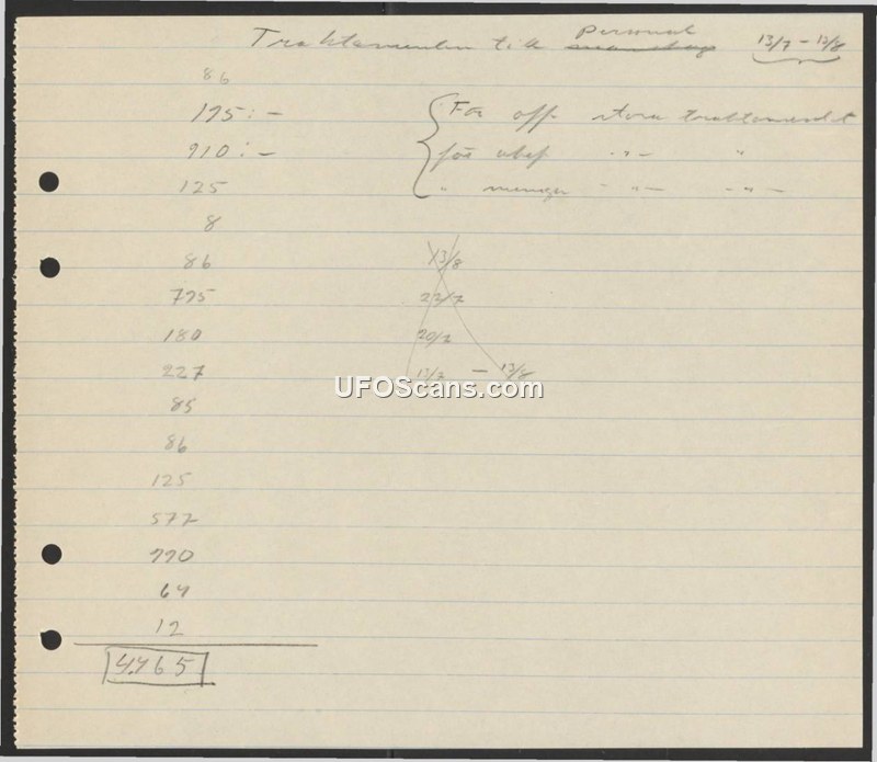 This document is a handwritten accounting ledger or expense sheet titled 'Traktementer til personell 13/7 - 13/8' (Allowances for personnel 13/7 - 13/8). It lists a series of numerical values, likely representing monetary amounts, which are summed to a total of 4765. The document includes annotations categorizing these expenses into three groups: 'For off. store traktementet' (For officers' large allowance), 'for ubef' (for non-commissioned officers), and 'menige' (privates). The document also contains a series of dates (13/8, 3/8, 22/7, 20/7, 13/7) written in a column, suggesting a timeline for the recorded expenses.