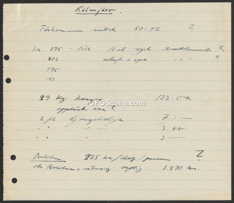This document is a handwritten financial record or expense ledger pertaining to activities at Kölmjärv. The text lists various costs and quantities, including 29 kilograms of an item transcribed as 'kanye' and two units of 'gjangolja' (thread-cutting oil). Additionally, the document notes a daily rate of 225 kronor per person and references a calculation related to Boliden totaling 1,890 kronor. The document appears to be a routine administrative or logistical record rather than a formal report on aerial phenomena.