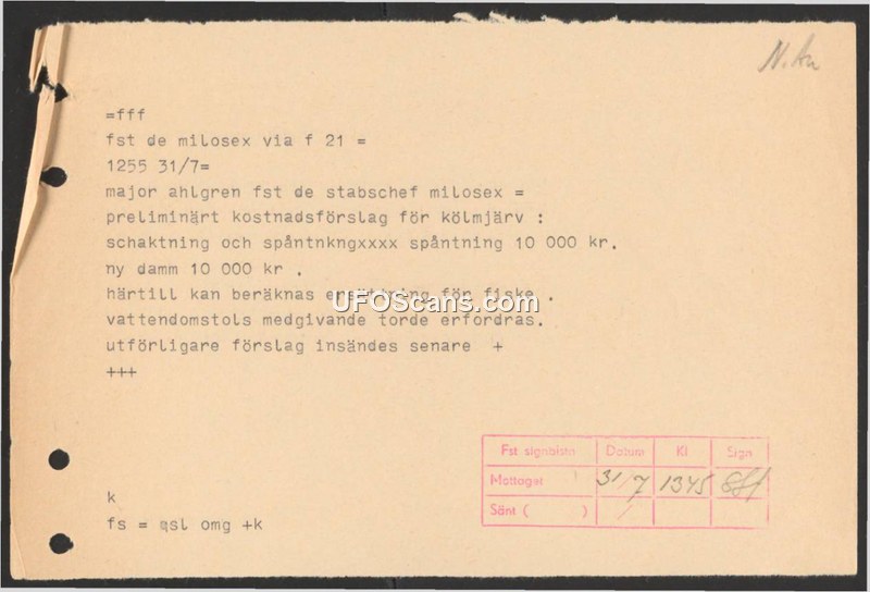 This document, dated July 31, 1945, is a brief communication from the Swedish Defense Staff (Fst) regarding a preliminary cost estimate for a project at Kölmjärv. The correspondence mentions Major Ahlgren, the Chief of Staff at Milosex. The estimated costs provided are 10,000 SEK for excavation and sheet piling, and an additional 10,000 SEK for the construction of a new dam. The document further notes that compensation for fishing rights may need to be calculated and that the approval of the Water Court (Vattendomstolen) will likely be required for the project to proceed. The author indicates that a more detailed proposal will be submitted at a later date.