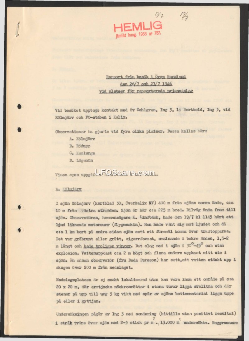 This document is a secret field report regarding a visit to Upper Norrland on July 26 and 27, 1946, to investigate reported impact sites. The investigation involved contact with Colonel Dahlgren and Lieutenant Barthold of Ing 3, as well as the FO-staff in Kalix. Four specific locations were identified for investigation: Kölmjärv, Rödupp, Kanlunge, and Lägenön. The report focuses on the Kölmjärv site, where a witness, K. Lindbäck, reported hearing a sound resembling a motor hum on July 19, 1946, at 11:45. He observed a gray-brown or gray, cigar-shaped object, approximately 1.5 to 2 meters long, which likely had wings. The object reportedly flew over the treetops and descended into the lake at a 30-45 degree angle without exploding. The impact caused water to spray up to 2 meters high, with another witness, Beda Persson, observing water splashing into the forest over 200 meters from the impact site. The impact area is estimated to be within a 20x20 meter zone, where investigators found torn-up water lily roots and stones weighing up to 5 kg covered in lake bottom material. As of the time of the report, Ing 3 was conducting soundings of the lake, but had not yet achieved any positive results.