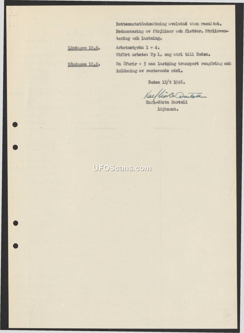 This document is a brief field report authored by Lieutenant Karl-Gösta Bartoll in Boden, Sweden, dated August 12, 1946. The report details the conclusion of a 'bottom resistance measurement' (bottemotståndsmätning), which was completed without yielding any results. Following the conclusion of this measurement, the report outlines the subsequent logistical activities performed by a work crew. On Saturday, August 10, a crew of five (1+4) performed the dismantling of ferry lines and rafts, and transported equipment to Boden. On Monday, August 12, a crew consisting of one corporal and three men completed the transport, cleaning, and storage of the remaining equipment.