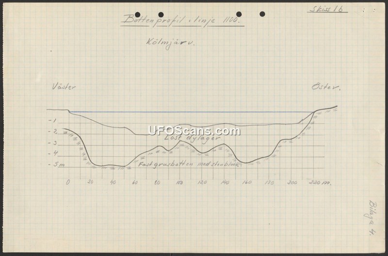 This is a technical cross-section drawing of the lake bottom at Kölmjärv, Sweden, showing sediment layers and depth profiles. It is labeled as Sketch 16 and Appendix 4.