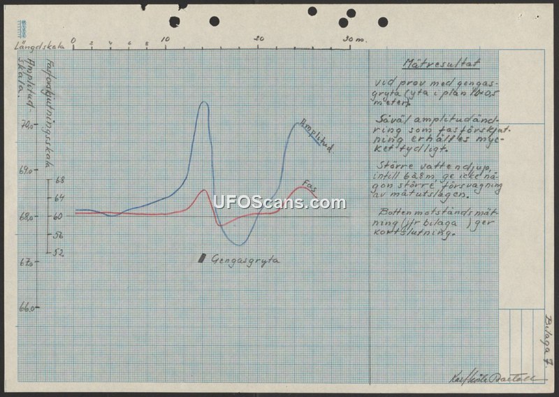 This document, labeled 'Bilaga 7' (Appendix 7), provides technical measurement results regarding a 'gengasgryta' (producer gas generator). The document consists of a graph plotting amplitude and phase against a scale, accompanied by a brief text summary of the findings. The text states that both amplitude and phase shift are clearly observable during testing. Furthermore, the report notes that increasing the water depth up to 6-8 meters does not result in any significant weakening of the measurement signals. Finally, it is noted that bottom resistance measurements, which are referenced as being in an attachment, result in a short circuit.