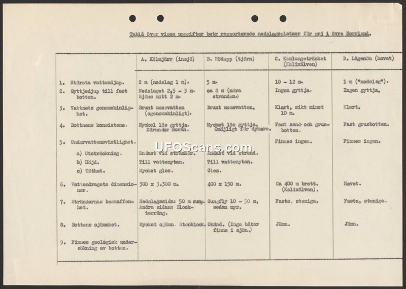 Tablå över vissa uppgifter betr rapporterade nedslagsplatser för prj i övre Norrland