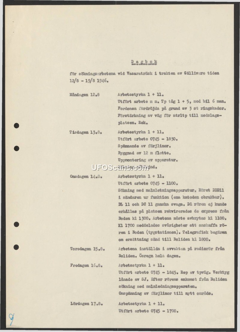 Dagbok för sökningsarbetena vid Vasaraträsk i trakten av Gällivare tiden 12/8 - 19/8 1946