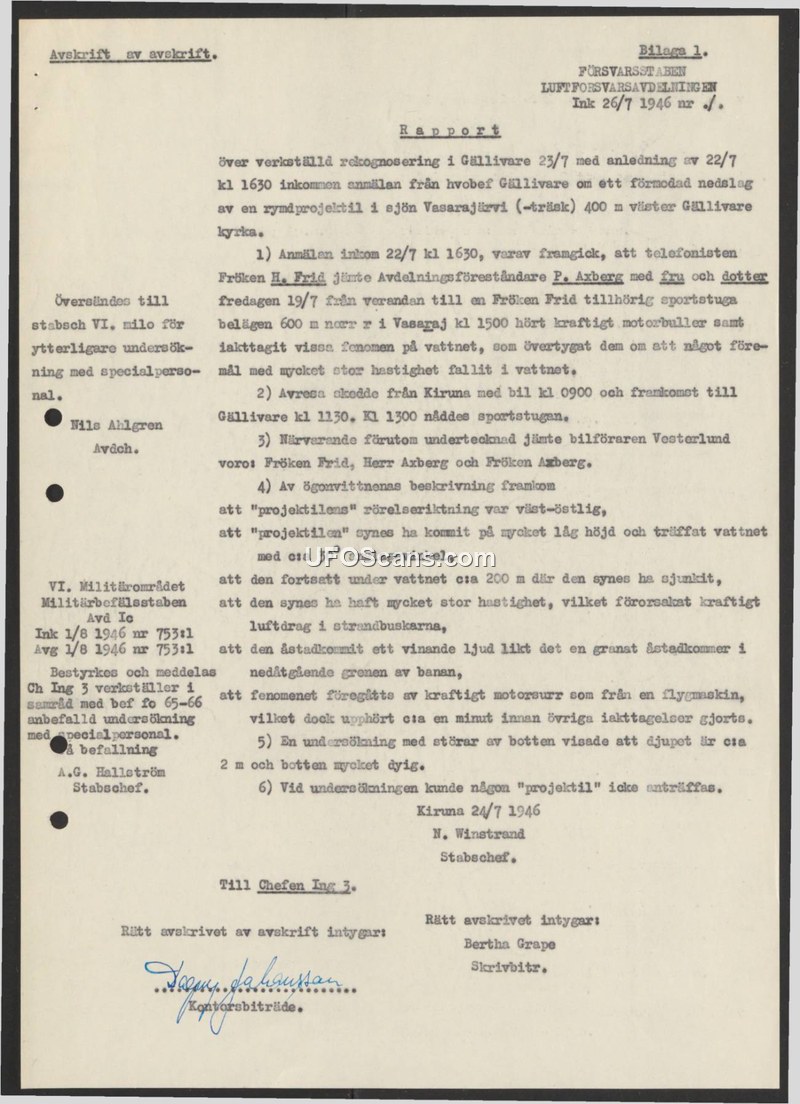 This report, dated July 24, 1946, details an investigation conducted by N. Winstrand, Chief of Staff, regarding a reported impact of a 'space projectile' in Lake Vasarjärvi, located 400 meters west of the Gällivare church. The initial report was received on July 22, 1946, following an incident on July 19, 1946. According to the witnesses—Fröken H. Frid, P. Axberg, and his family—they were at a summer cottage at 15:00 on July 19 when they heard a loud engine noise resembling an airplane. This noise ceased approximately one minute before they observed a phenomenon on the water. The witnesses described the object as moving at a very high speed from west to east at a very low altitude. It reportedly struck the water at an angle of approximately 30 degrees and continued underwater for about 200 meters before sinking. The object's passage was said to have caused a strong air draft in the nearby bushes and produced a whining sound similar to that of a grenade in flight. An investigation of the lake bottom was conducted on July 23, 1946, using poles. The investigators determined the water depth to be approximately 2 meters with a very muddy bottom. Despite the search, no projectile was found. The document includes administrative notes indicating it was forwarded to the VI Military District for further investigation by specialized personnel.