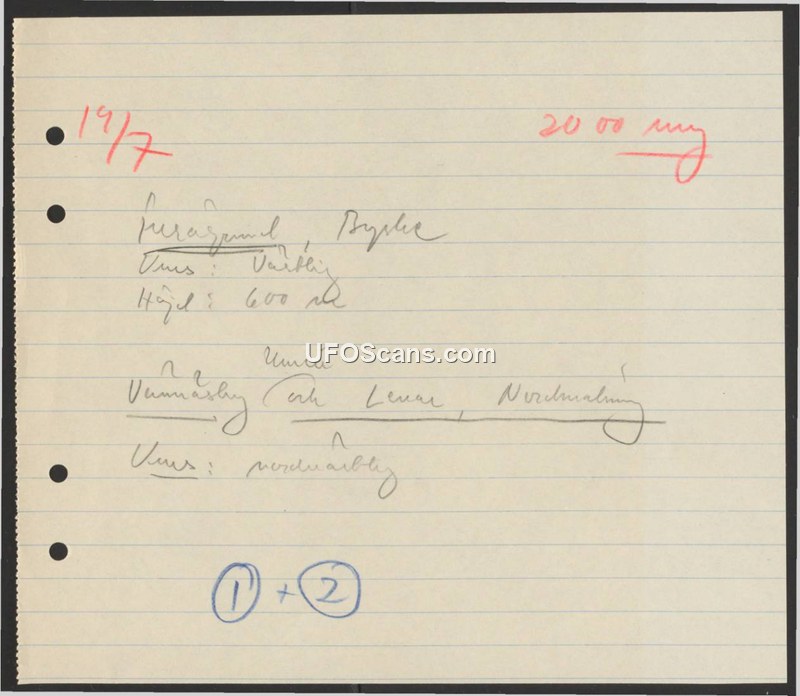A handwritten field note recording an aerial sighting in Vännäsby, Sweden, on July 19 at 20:00, noting an altitude of 600 meters.
