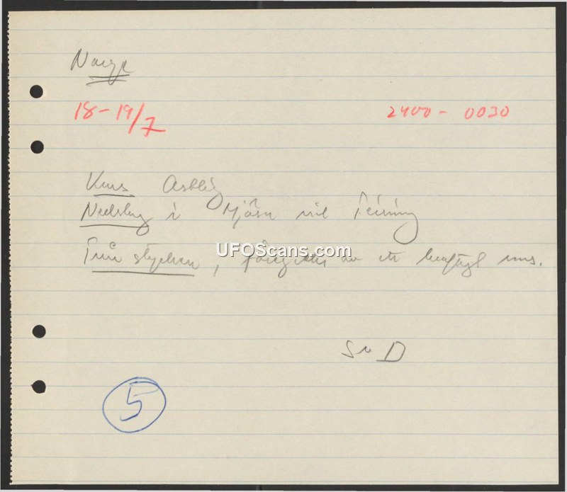 This document is a brief, handwritten note documenting an incident that occurred at Mjøsa, Norway, between the 18th and 19th of July. The incident took place between the hours of 2400 and 0030. The text mentions a sighting or event involving an object, though the specific details are limited due to the brevity of the note. The document includes the number '5' circled at the bottom, possibly indicating a page number or file reference.