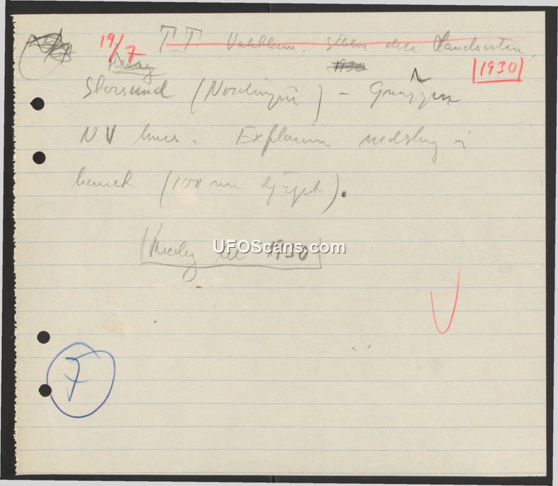 A handwritten note documenting an explosion or impact event at Storsund, Norway, on July 19, 1930, affecting a depth of 100 meters.