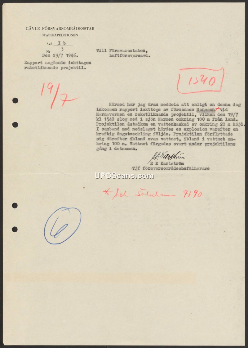 A report from the Gävle Defense District Staff regarding a rocket-like projectile that crashed into Lake Marmen on July 19, 1946. The object caused a 20-meter water cascade, an explosion, and steam, before moving through the water.