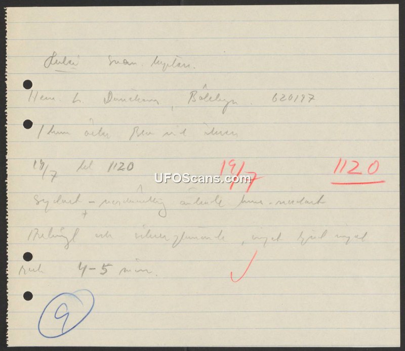 This handwritten document is a brief field report regarding a sighting that occurred on July 19th at 11:20. The location is identified as Bolebyn. The report notes that the event lasted for a duration of 4 to 5 minutes. The text is written in Swedish and includes a reference number, 620197. The document is sparse, containing minimal descriptive details regarding the nature of the sighting itself, focusing primarily on the temporal and locational data of the incident.