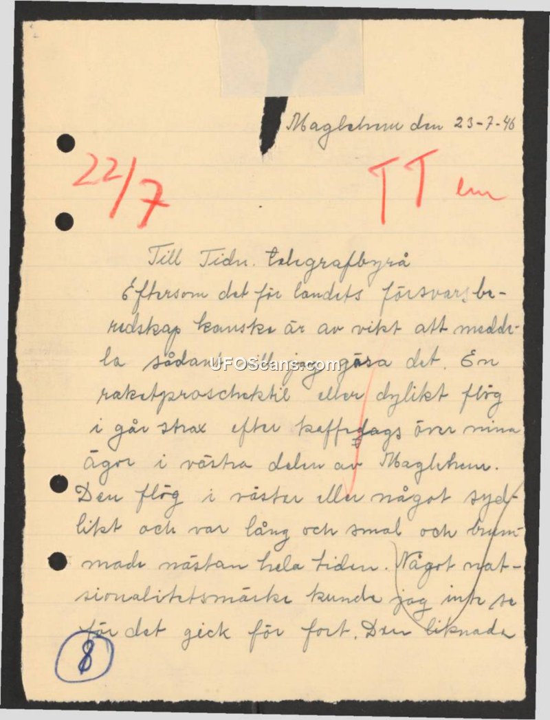 Sighting Report - Maglehem, Sweden, July 22, 1946